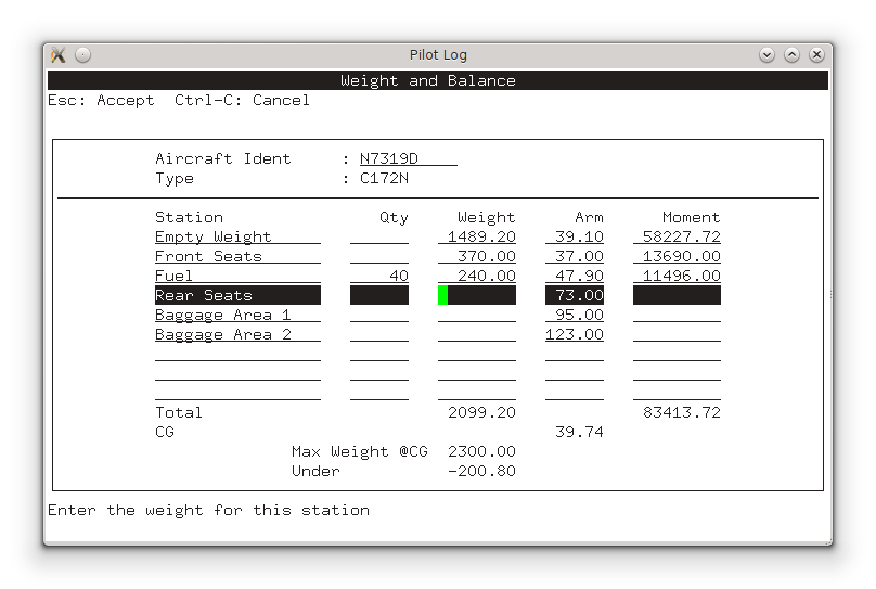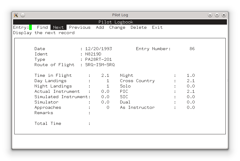 OverviewPilot Log is a free, aviation logbook application for pilots to log flight time. The user interface is ncurses, text-based. The program is run in a terminal either locally or on a Linux virtual machine. Pilot Log was developed by Stansoft. It utilizes a PostgreSQL database, which means the logbook data can easily be exported for use with other software or imported. An advantage of using a relational database design is that the aircraft registration number is tied to the category and class so they don't need to be entered for each flight, but will automatically be tracked for reporting. Pilot Log includes a program for calculating aircraft weight and balance. Download